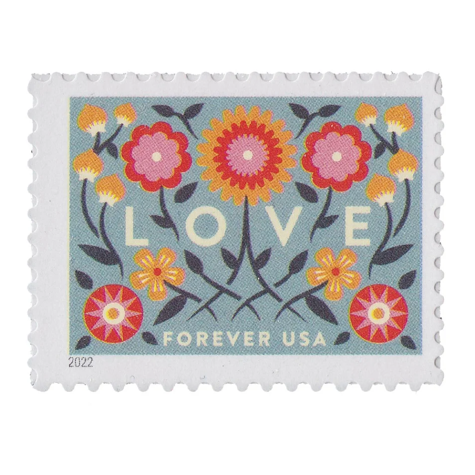 About the stamp design:??Pictures graphic illustrations of flowers inspired by European folk art.? Shows twisting vines, small flowers, and abstract heart shapes.? The stamp has a powder blue background.