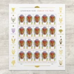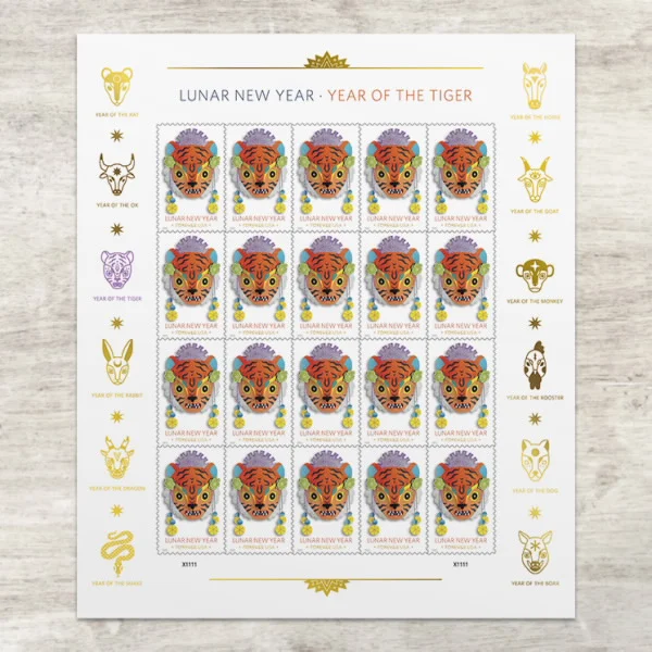 Utilizing orange as the predominant color ??characteristic of the markings of Bengal tigers and said to be one of the lucky colors for individuals born during the Year of the Tiger??the tiger mask in the stamp design incorporates elements with symbolic meaning.